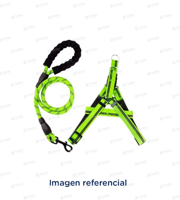 Arnés de nylon con cintas reflectivas regulable + soga con sujetador.