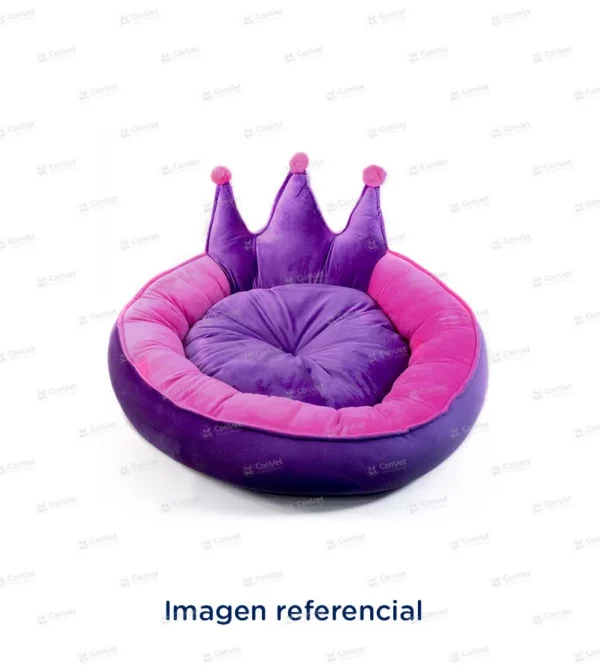 Cama con forma de corona ideal para perros y gatos, de fácil adaptación con espuma y tela fresca. Estructura rígida estable.