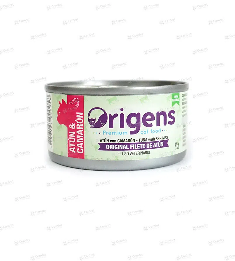 El alimento para gatos origens filete de atún con camarón está recomendado para brindar una alimentación completa.