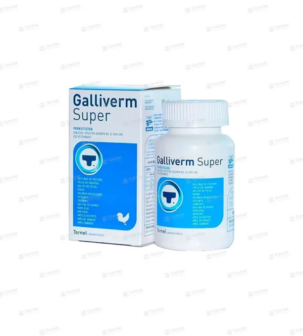 Galliverm Super es un parasiticida de amplio espectro, en tabletas orales para administrarse a las siguientes aves: gallina de postura, pollo de engorda, gallos de pelea, gallinas de pelea, pavos, palomas mensajeras, faisanes, codorniz, gallina de guinea, pavo real, avestruz, aves silvestres, de ornato y aves canoras. Elimina y previene infestaciones por parásitos del esófago, buche, estómago, intestinos, ciego, tráquea y pulmones. La fórmula de Galliverm Super es efectiva contra los siguientes parásitos: Ascaridia spp, Heterakis gallinarum, Capillaria spp, Gangylonema ingluvicola, Dispharynx nasuta, Cheilospirura spp, Railletia spp, Hymenolepis spp, Tetrameres cyanea, Syngamus trachea, Trichinella.