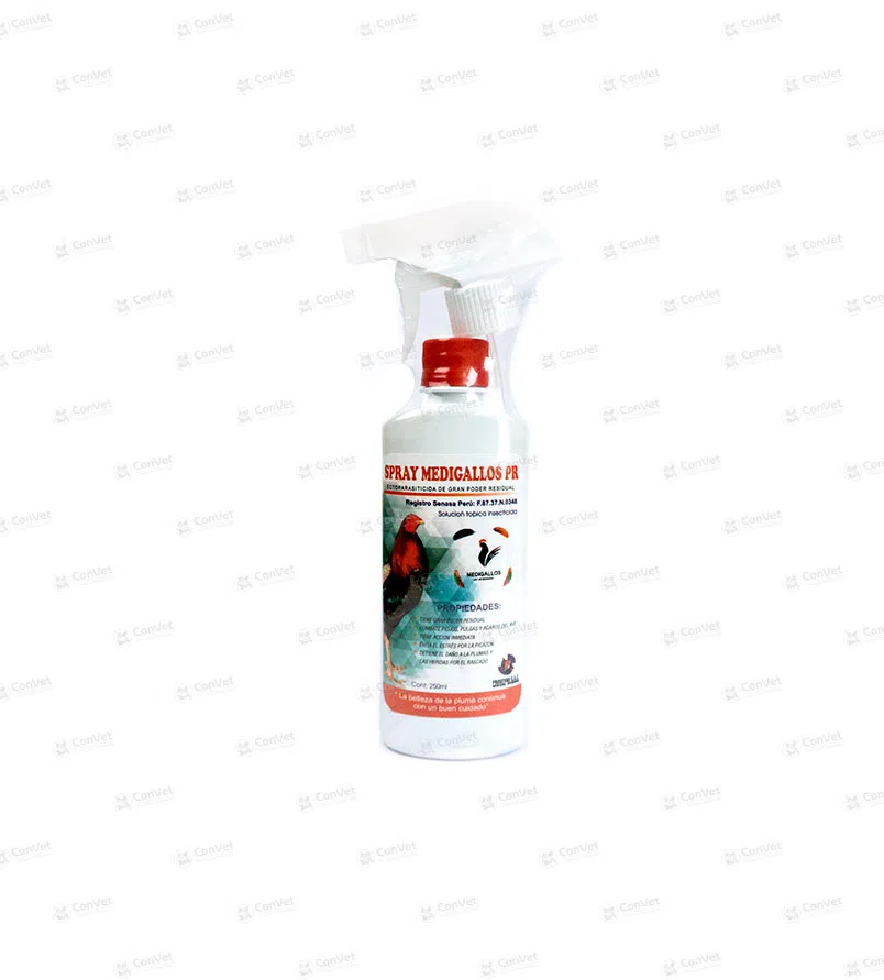 SPRAY MEDIGALLOS PR es un antiparasitario externo de uso tópico con acción insecticida de efecto prolongado, que controla de forma rápida y efectiva la infestación de pulgas, piojos y ácaros en las aves. Spray Medigallos PR por su gran poder residual puede proteger a sus aves contra pulgas, piojos y ácaros por más de 30 días